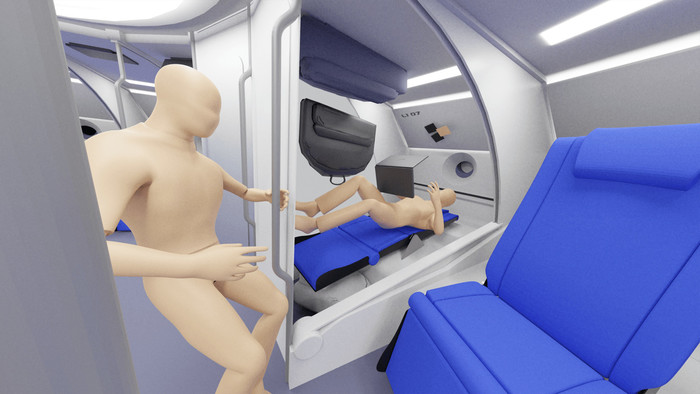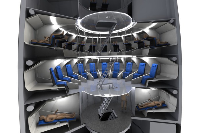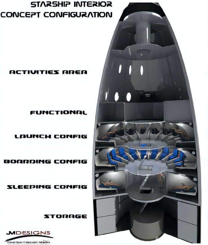 Американский дизайнер интерьеров самолетов Джим Мерфи разработал концепт интерьера космического корабля SpaceX Starship с сиденьями для ускорения взлета и посадки, размещенными в отдельных каютах и выполняющими роль трансформируемых кроватей.