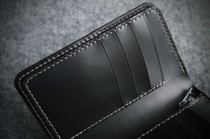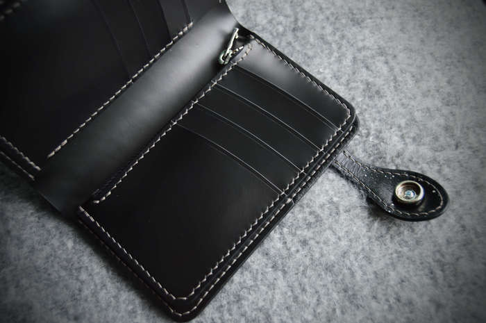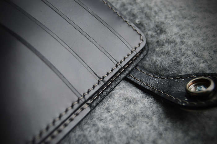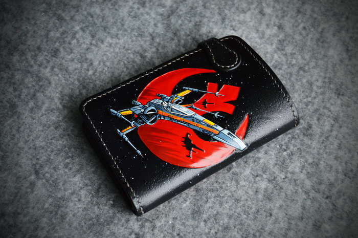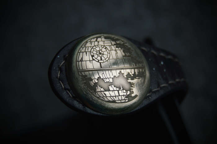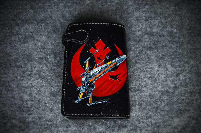 Рисунок вытиснен на коже растительного дубления толщиной 1,8 мм, расписан спиртовыми красками и акрилом. Для внутренней части использовал кожу толщиной 0,8 мм с умеренным блеском. Собирал на льняной нити толщиной 0,45 мм, шаг пробойника 4 мм. Внутри 1 отделение для купюр, 8 кармашков для карт, монетница на молнии и по небольшому кармашку за блоками карт. Для дополнения темы была изготовлена пуговица (кончо) на кнопку: снят старый отчеканенный рисунок и выгравирован лазером рисунок Звезды Смерти после встречи со Скайуокером.