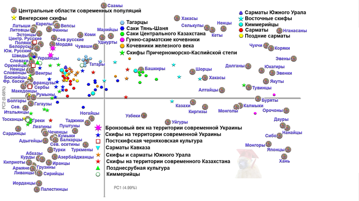 График главных компонент образцов из данного исследования вместе с опубликованными скифскими, сарматскими и связанными с ними древними образцами, спроецированными на фон современных популяций, показал, что древние образцы, как правило, не перекрываются с современными вариациями.