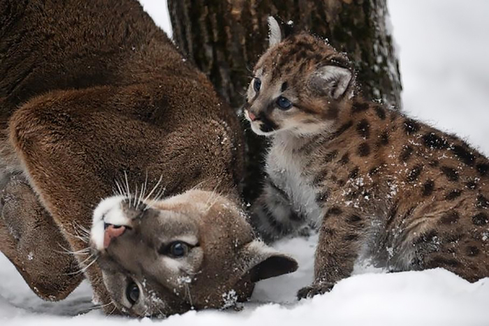 7. Окрас детенышей пумы отличается от окраса взрослых особей. В отличие от песочных однотонных взрослых, пумьи детишки покрыты тёмными пятнами, полосами на лапах и кольцами на хвостах. А ещё они голубоглазы.