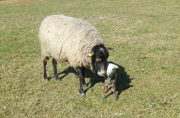 А весной случилось то, что бывает, когда животных доверяют глупым неопытным людям. Они начали рожать. Естественно, первый ягненок родился на моих глазах. С утречка я пошла к своему стаду и увидела, что у овцы из зада вываливается пузырь. Я была в курсе, что часть стада беременна, так что сразу заподозрила неладное. Начала срочно звонить маме и в ужасе кричать, что животное надо спасать, там пузырь из задницы никак не вылезет, все пропало. Отсмеявшись, мама меня успокоила - все в порядке, это начались роды. Мама по образованию ветеринар, так что успела в молодости и не такого навидаться, хотя почти и не работала по специальности после университета. Но базовые знания остались, так что я успокоилась. И принялась ждать. Так я увидела рождение первых ягняток и морда моя едва не треснула от умиления, ведь они такие миленькие.