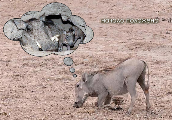 Дело в том, что основой рациона этой свинки является трава, но его пятачок – не лучший инструмент для срезания грубых стеблей саванных трав, вот и приходится ему падать ниц и захватывать пучки растительности всей пастью. А вычистив всё съестное на одном участке, бородавочник так же попой кверху переползает на следующий.