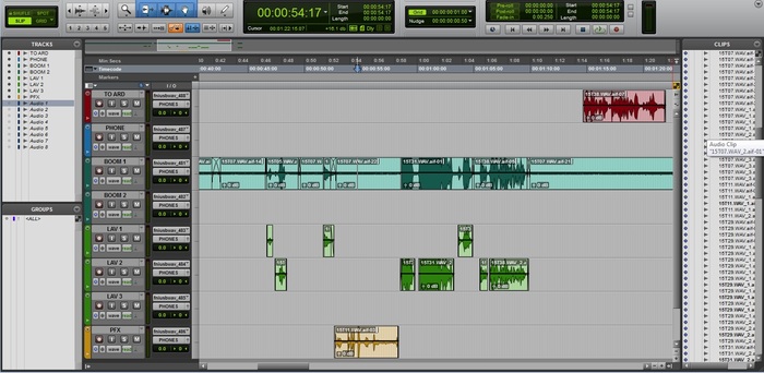 Подготовка произошла. Теперь начинается непосредственно съемка. Как я уже писал ранее, для большого кино - главное записать как можно чище реплики. И тут сразу стоит оговорится, что это очень размытое понятие, и коротко определить, что такое чистовая фонограмма - не получается. Человеческий слух устроен так, что равномерный шум небольшого уровня мы быстро перестаем замечать, и ухо к нему привыкает, так что в каких-то случаях реплики с таким фоном будут вполне чистовыми. Где-то может быть много реверберации (акустики помещения), но и в кадре общий план, и видно это все помещение, и реплика в таком кадре звучит органично. Что-то легко потом вычищается, как, например, тональное гудение от ламп (хотя бывает и не получается). В любом случае, такую чистую и сухую реплику как в студии на площадке записать обычно не возможно. Но есть и много случаев откровенного брака, когда какой-то звук заглушил реплику или ее часть, поверх реплик шум высокого уровня, да еще в добавок постоянно изменяется (пример - широкое шоссе рядом: реплика различима, но зашумлена), так что его сложно или не возможно потом вычистить, не повредив тембр реплики.