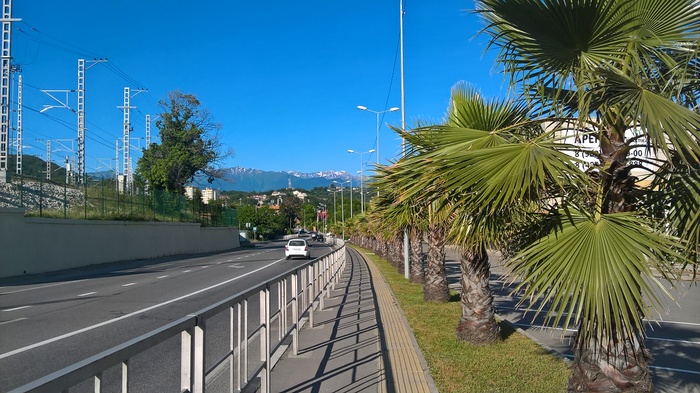 Пальмы на переднем плане, и снег в горах -- на дальнем (снято 2016.06.13)