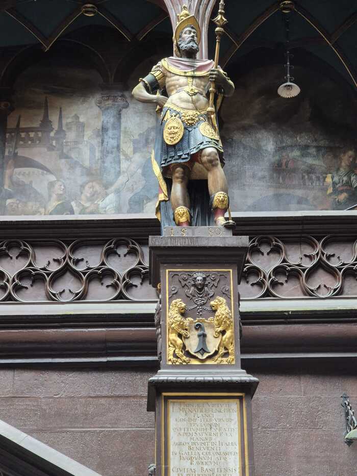 ### Архитектура и внешний вид - Главная фишка — **ярко-красный песчаник** (отсюда народное название **Roothuus** — «Красный дом», игра слов с «Rathaus»). - Фасад богато украшен **фресками**, росписями, позолотой, статуями, гербами, орнаментами в стиле поздней готики + ренессанс + историзм. - Особенно выделяется **готическая башня** с часами и фигурками. - На фасаде — гербы кантонов, исторические и аллегорические сцены.