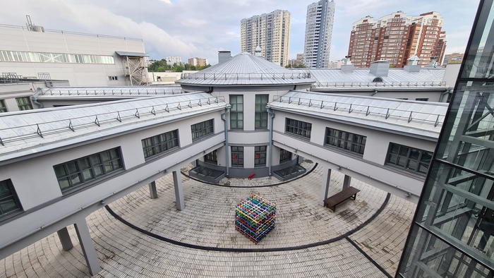 Как и весь Тольятти, «АВТОВАЗ» также поражает своим размахом — его площадь 600 гектаров! Конечно, доступ на территорию предприятия ограничен, но вход туда и не потребуется. Нас интересует буквально главное здание города — высотка генеральной дирекции (заводоуправления) «АВТОВАЗа». 25-этажное здание - самое высокое в Тольятти. Сегодня образ высотки мало напоминает советский модернизм, в первую очередь из-за своих ярких цветов, нетипичных для архитектуры советского времени. Все потому, что достраивали ее уже во второй половине 1990-х годов. К сожалению, это не редкая история для Тольятти, с которой мы еще столкнемся во время нашего маршрута — распад Советского Союза внес много корректировок в реализацию градостроительных и архитектурных планов города.