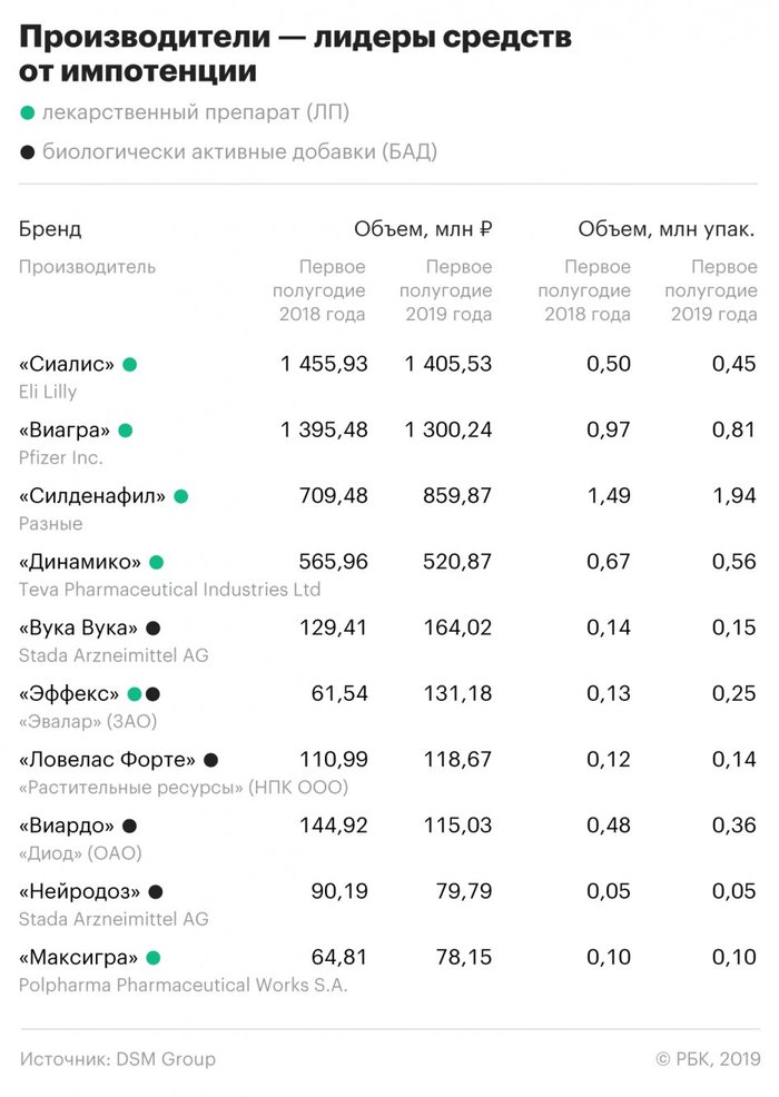 Самые популярные на рынке лекарства — до сих пор оригинальные «Сиалис» от Eli Lilly и «Виагра» от Pfizer. Их продажи составили соответственно 1,4 млрд руб. и 1,3 млрд руб.
