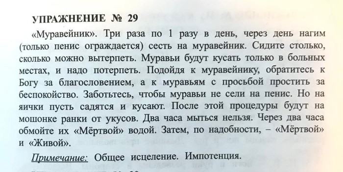 Три раза по 1 разу в день, через день нагим (только пенис ограждается) сесть на муравейник. Сидите столько, сколько можно вытерпеть. Муравьи будут кусать только в больных местах, и надо потерпеть. Подойдя к муравейнику, обратитесь к Богу за благословением, а к муравьям с просьбой простить за беспокойство. Заботьтесь, чтобы муравьи не сели на пенис. Но на яички пусть садятся и кусают. После этой процедуры будут на мошонке ранки от укусов. Два часа мыться нельзя. Через два часа обмойте их «Мёртвой» водой. Затем, по надобности, - «Мёртвой» и «Живой».