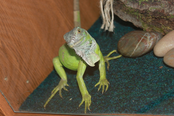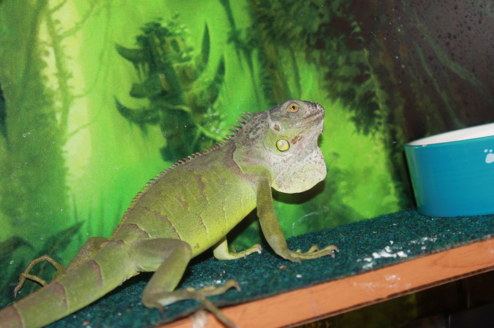 Знакомьтеси. Это - Зюзятина. Зюзя. 7-ми месячный самец зелёной игуаны. Примерно 2 недели назад я выкладывала пост "Чешуя". Так вот так была игуана. И именно после этого я решилась и купила себе малька. И вот это чудо уже третий день живёт со мной и актино учится открывать двери террариума лапой. И на слова "Зюзя, нет!" недовольно прищуривается и утопывает в домик.