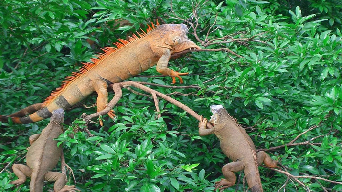Только вот разглядеть третий глаз непросто. Мало того, что он небольшой, так ещё сначала нужно найти саму игуану. Попробуй обнаружить это зелёное тельце посреди густых джунглей! Не облегчают задачу и размеры рептилии: пусть взрослая животина и вырастает до 2 метров, но большая часть длины приходится на хвост. Длина от ноздрей до попки не более 40 сантиметров.