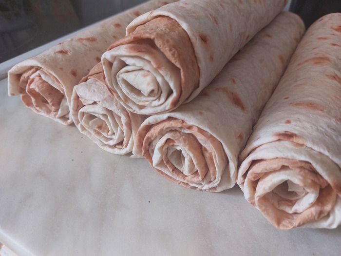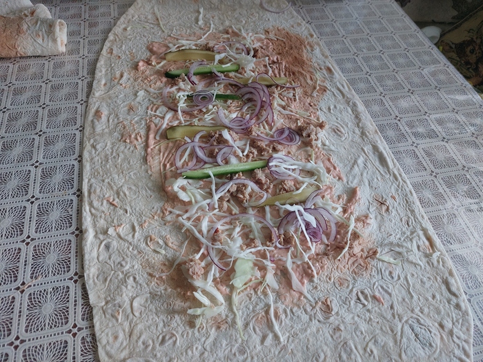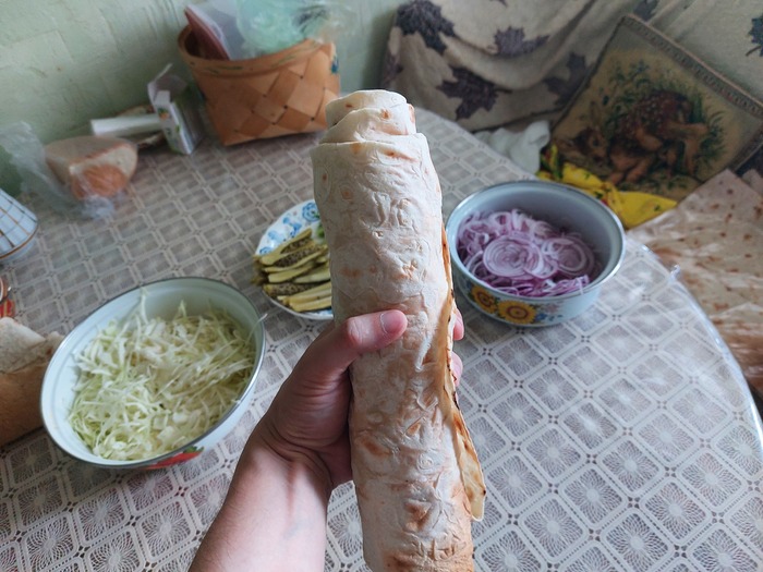 ➡️Собираем шаурму. Смазываем соусом и выкладываем все овощи, курицу. Сворачиваем и обжариваем слегка на гриле или на сухой сковороде.