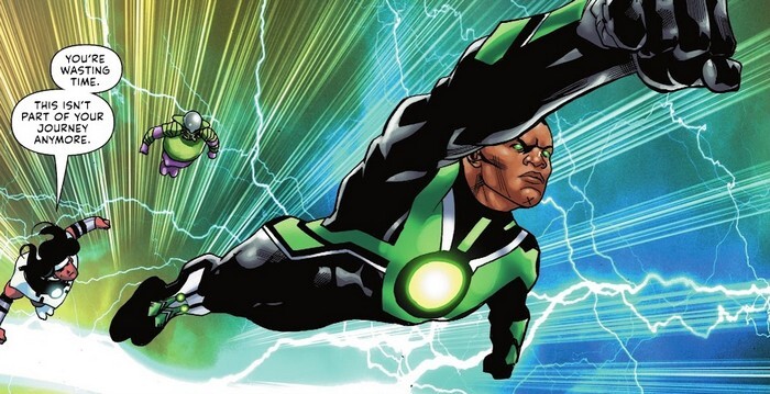 Всё ещё не можете нащупать сюжет? Я тоже! Погнали вместе в комикс Green Lantern #10. Читателю показывают Лорда-Префекта «Изумрудной Стражи», Джона Стюарта (похоже, альтернативное будущее). Джон обращается к Страже и толкает речь на тему грядущей победы над безумным богом Исэком, создателем Тёмных Секторов и поработителем миллиардов разумных существ. Прямо в процессе речи Исэк нападает на Джона и видение рассеивается. Лонар кое-как приходит Джону на помощь и сообщает, что Джон уничтожил Несущего Свет и высвободил Бурю Богов. И теперь должен её впитать, иначе Буря уничтожит вообще всё. А Джону в этой буре продолжают являться видения альтернативного будущего. На сей раз является Катма Туи, его погибшая жена...и она жива. Джон показывает ей Мэнифолд, созданный им мир миров. «Была заварушка с безумным богом, он создал Бурю Богов, но я её сожрал. Или она меня, точно не помню. Но теперь всё будет хорошо. Я уже научился возвращать к жизни. Я спас тебя, и спасу всех остальных погибших». И опять его прерывает Исэк. Лонар подсказывает – тело Джона начало впитывать энергию Бури, но ему нужно определиться со своим будущим, чтобы энергия таки впиталась.