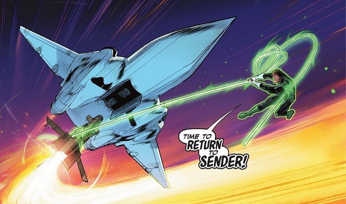 Хэл летит в Японию, и по пути узнаёт, что для глаза беспилотники тоже стали невидимыми с помощью системы линз. Впрочем, с помощью кольца он создаёт «фильтр», который позволяет увидеть беспилотник в Токио. Второй готов! Но поступают сообщения о нападениях на несколько других городов. Хэл понимает, что Синестро пытается поднять волну страха, и знает, как этому помешать. Выцепив какую-то журналистку, Хэл толкает пафосную речь о том, что людей от многих других жителей вселенной отличает способность преодолевать страх. Людям от такой речи аж легче на душе становится...но поступают новые известия. Один беспилотник летит в Вашингтон, второй – в Москву, и Хэл успеет остановить только один. Или нет? Сконцентрировавшись на максимальном превозмогании, Хэл создаёт две разных конструкции и отправляет в Вашингтон и Москву. И находит и уничтожает оба беспилотника! А затем находит самого Синестро. Тот сильно не в духе и сообщает, что что-то не так с Эмоциональным Спектром. Насколько? Ну...сильно. Настолкьо, что жёлтое кольцо Синестро вспыхивает красной вспышкой, питаемое уже не страхом, но яростью! Что из этого будет? Продолжение следует! Уж когда там новая порция наберётся...