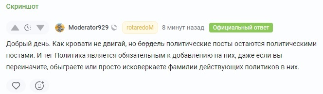 Согласно правил Пикабу посты с данными тегами(политка) могут требовать подтверждения из лицензированных СМИ. Во избежания удаления поста рекомендуют прикрепить ссылку на легитимный источник.