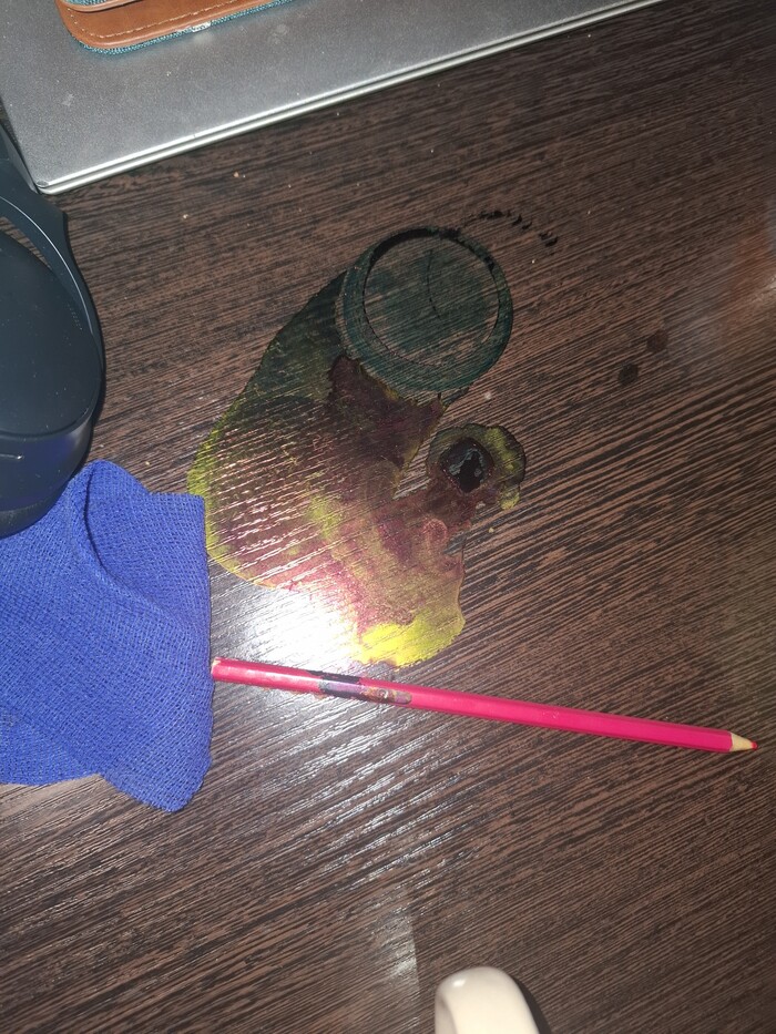 Сначала промачиваем зеленку сухим ватным диском, далее наносим димексид на ватный диск и оттираем пятно.