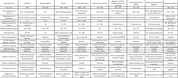 Важный момент: конкретные цены в таблицу по другим материалам я не включил. Экономику мы разобрали выше для 4х самых популярных материалов строительства, а здесь — сухая выжимка характеристик, включая шумоизоляцию, нюансы электрики и скорость заселения.