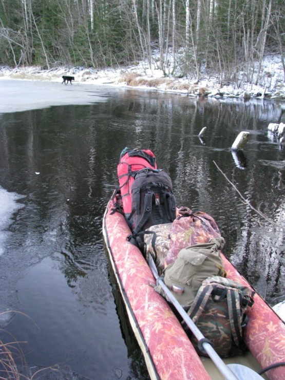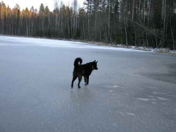 Собаке то быстро переметнуться с берега на берег, а мне обходить по ледяному полю надо.