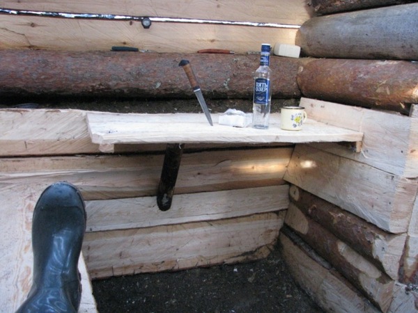 Это вот изголовье нар. Планировал жилье я в расчете на одного и поэтому сидеть за столиком, можно только одному. Делал так, что бы удобно было вести записи и обрабатывать добычу. Надо будет продумать этот момент, что бы веселее было за столом сидеть вдвоем во время обеда.