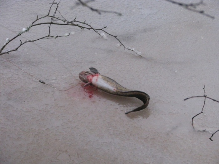 В конце путика у меня была выставлена жерлица на остатках приманки, и на неё сел небольшой налимчик.