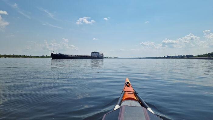 Река была всё такой же узкой, и суда, почти непрерывно идущие в обе стороны, проходили совсем близко как друг от друга, так и от каяка, каждый раз заставляя меня прижиматься к берегу.
