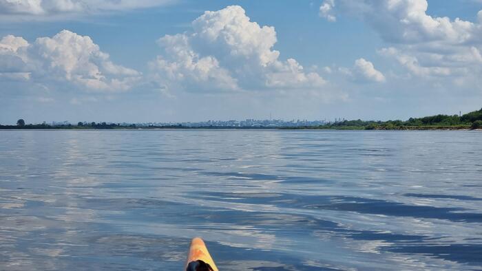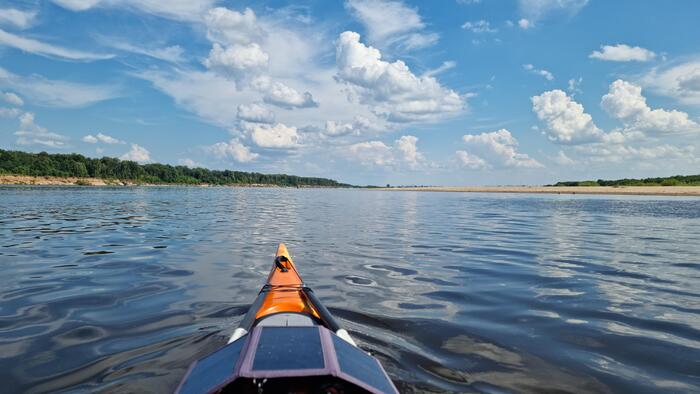 Когда я отходил от берега, каяк подхватило сильное попутное течение, подобного которому я не встречал уже с подходов к Твери. Это добавило мне оптимизма и вселило надежду на то, что сегодня я буду ночевать в мягкой кровати. Солнце, несмотря на утреннее время, уже было очень жарким. Но прохладный свежий ветер, установившийся над рекой, приятно охлаждал меня, создавая практически идеальные условия для длительного перехода.