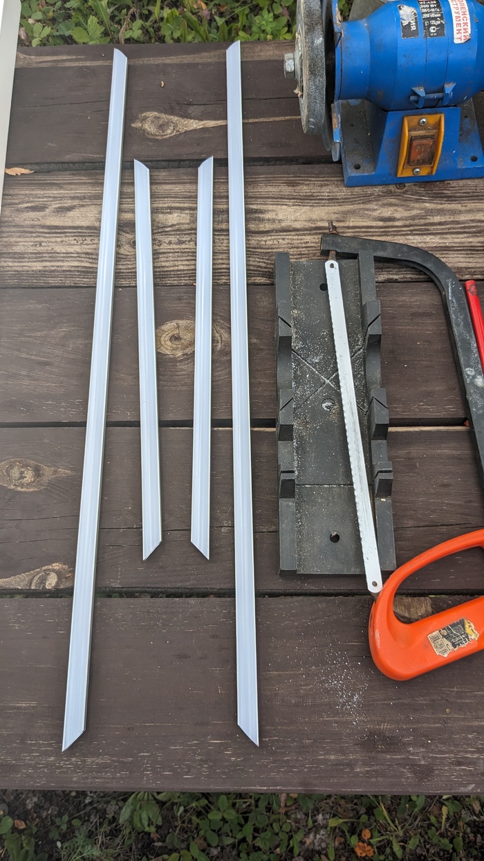 Подсветка будет светодиодная естественно, в самом узком профиле какой нашел вдоль внутреннего периметра рамы. Берём стусло, ножовку по металлу и точильный станок для тонкой подгонки, пилим, точим