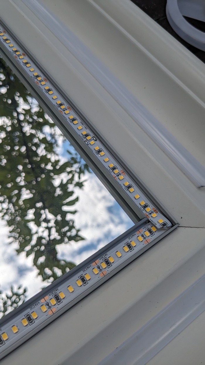 Дальше все просто, укладываю ленту, на углах ленту сгибаю, решение проверенное, проблем никаких не будет. Лента отрезается в определенных местах, с шагом в 3 сантиметра, иначе не получается. подпаиваю выводы, закрываю светорассеивающие профилем и в целом готово