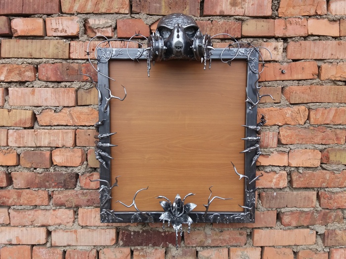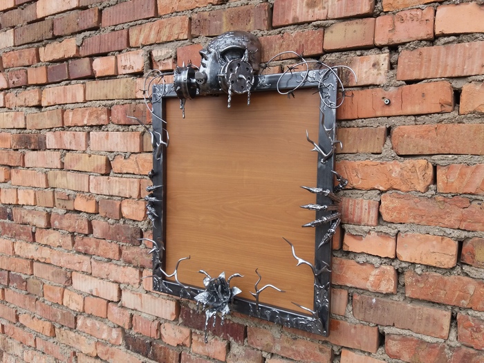 Когда-то мы занимались художественной обработкой зеркал (я же говорил, мы люди увлечённые). Зеркало с виноградом имело размеры 2000x1500 мм. Закончив работу и упаковав изделие, мы с женой начали укладывать его в машину. Когда зеркало было уложено послышался лёгкий и непередаваемый звук неприятности. От правого нижнего угла пошла стрела. Позвонил заказчику, рассказал о трагедии и пообещал вернуть деньги. Зеркало же повёз в мастерскую, где решил сделать ему редизайн и оставить себе. Отрезал волной от края полоску с трещиной и запескоструил. Получился очень интересный вид. Привёз домой, и понял что в интерьере зеркало смотрится ещё лучше. Позвонили заказчику, поведали о преобразовании изделия. Решили, что он посмотрит и если ему понравится то заказ будет выполнен. Собственно это и случилось. Остался я без зеркала, а заказчик с.