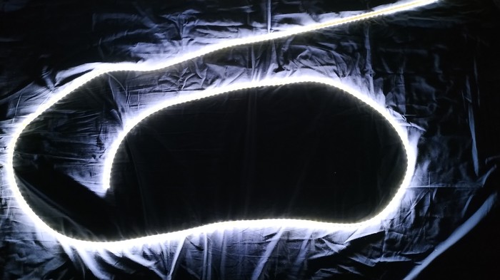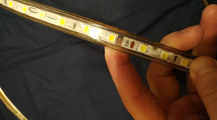 Выбрал я для себя ленту 220V, чтобы не мучиться с адаптером и пайкой. Светодиоды тут 5050, что довольно средненько, плотность 60 диодов на метр, световой поток 660Лм/м, плюс все это а защитной оболочке IP68.