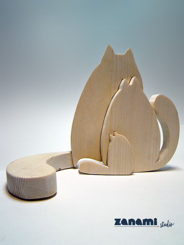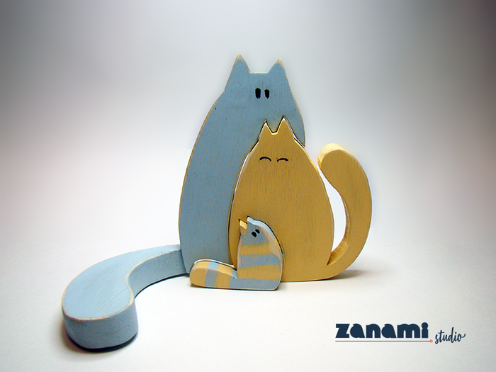 Одна из наших знакомых увлекается собиранием кошек (нет, она не сильная независимая женщина) и я решил сделать для неё кошачью семью. Первоначально дизайном предусматривалось, что хвосты папы кота и мамы кошки будут одинаково направлены вверх. Но волей случая и моей рукожопости кот совершил прыжок веры и лишился своего пушистого аксессуара. Отломался хвост, конечно же самым извращённым способом, поэтому о склейке изделия не могло идти речи. Выругавшись неприличным словом было решено изменить концепцию. Отпилив повреждённые участки и зашкурив филейную часть фигурки, хвост был размещён в предварительно выбранном пазу. Для надёжности внутрь был установлен металлический штифт в лучших традициях современной медицины и склеено высокотехнологичным ПВА. В результате получилась более устойчивая конструкция с более привлекательным ассиметричным видом.