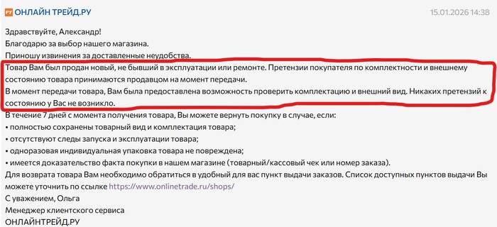 Утверждают, что я «должен был вернуть за 7 дней», хотя сами прислали ответ только на 11-й день. Нормально, праздники же, и зуй с этими покупателями)
