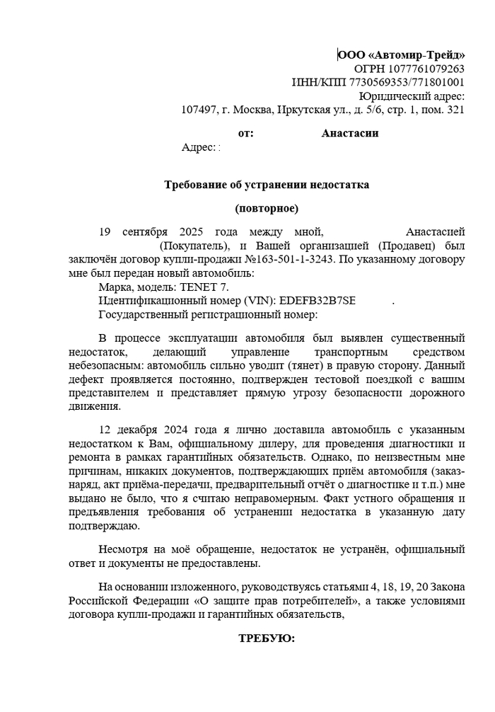 А давайте порассуждаем, что мы в такой ситуации можем сделать. Однозначно у нас есть недостаток, машинки боком ездить не должны. Уже исключен дефект резины (была замена на зиму), был сход развал, а значит что? Значит у нас есть неустановленный недостаток. Разве мы должны в нем разбираться? Нет. Нам надо исключительно доказать факт наличия недостатка, а дальше бремя доказывания переходит на продавца/импортера (п.6 ст.18 ЗоЗПП). Рассуждение продавца, а может это вы сами повредили или наехали на что-то - ничтожны. Они должны не просто сказать, а ДОКАЗАТЬ! что это сделали вы, а это очень тяжело. Недостаток у нас явный, девушка с представителем салона проехала и на видео зафиксировали. А что дальше? Надо предъявить требование об устранении недостатка. А что это? Требование об устранении недостатка - это ваше право, а вот форма реализации вашего права законом не определена, а значит любое действие направленное на устранение недостатка - является реализацией данного права (смог в суде доказать без видео, что устно предъявил требования, суд это принял и в определении отразил). Но мы знаем, что самое эффективное - это как для самых маленьких, поэтому родился вот такой документ