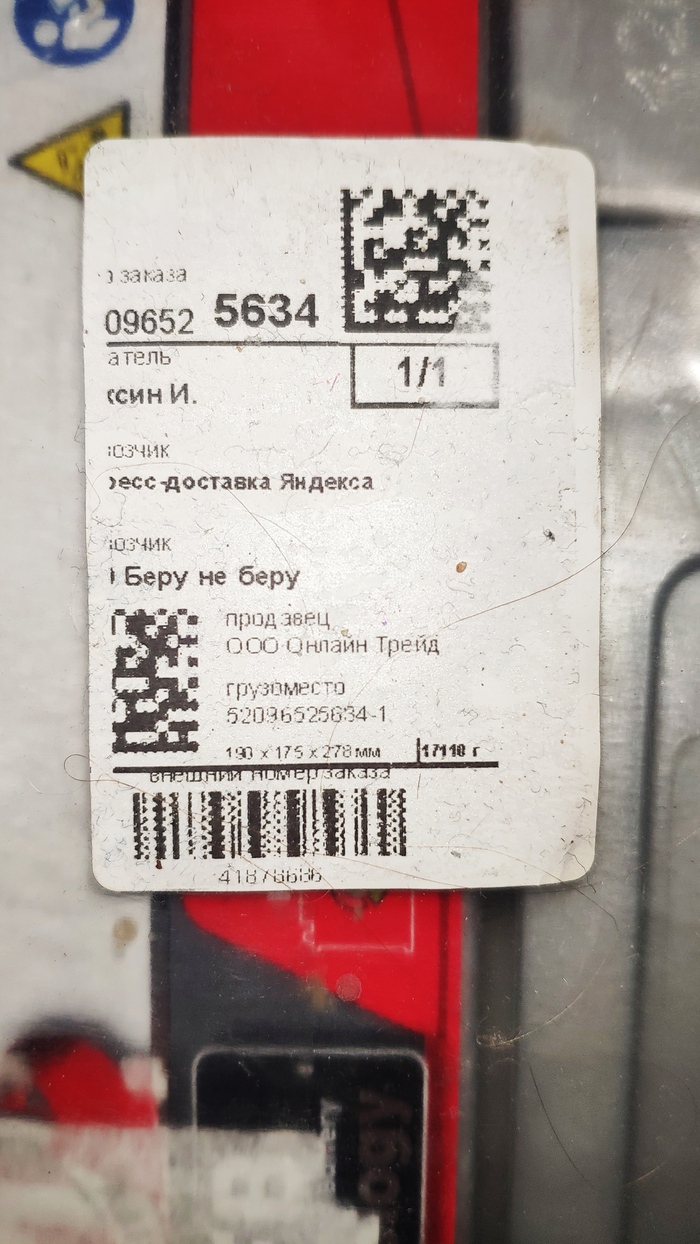 Ииии... самая классная фишка: на корпусе была заклеена наклейка от Яндекс Доставки. Я её отклеил и увидел ЧУЖОЙ штрих-код и номер заказа. То есть его продали, недобросовестный покупатель попользовался им и вернул как новый. В сервисе приняли без осмотра (как я, лошара) и решили втюхать другому клиенту.