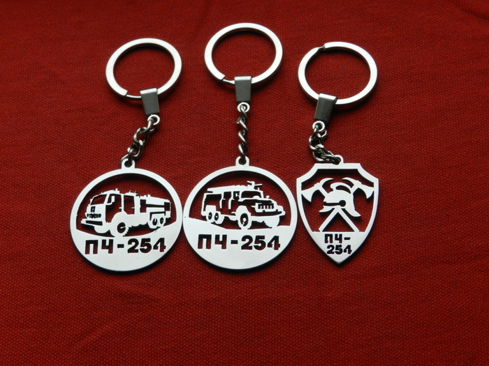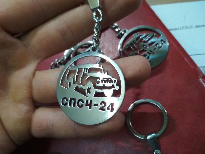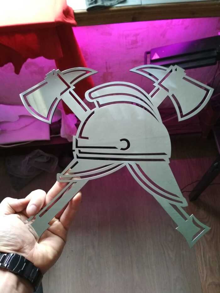 А так еще было сделано несколько больших из нержавейки потолще (3мм). Сейчас она висит вместо пожарного колокола (фото может еще сделаю, найти не смог). Совместил каску с топорами, звезду, зилы и пожарный вертолет. Была еще просто каска с топорами, не вспомню для кого.
