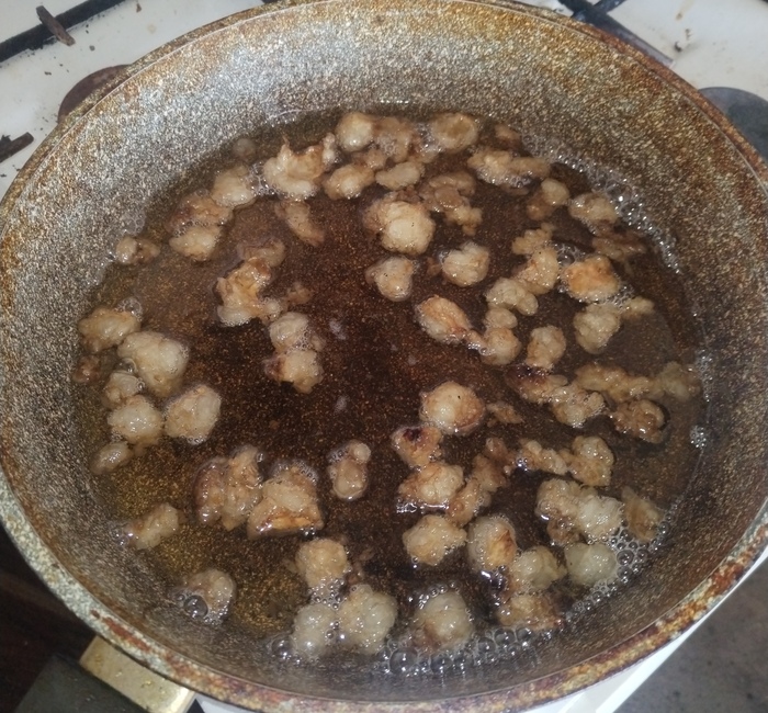 Его нужно порезать на кусочки 1,5- 2 см и на медленном огне топить. Заняло это у меня около 30 минут.