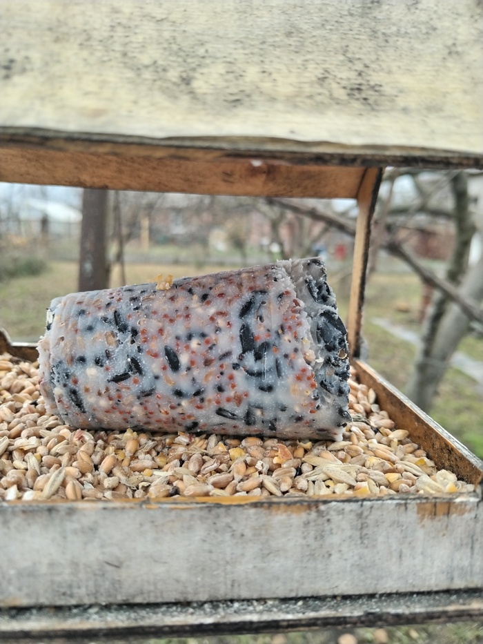 Застыло это всё довольно быстро. Стаканчик разрезала и выложила подкормку в кормушку.