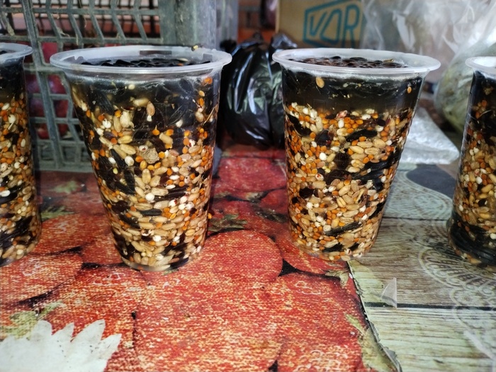 Затем насыпала семена в одноразовые стаканчики и залила слегка подостывшим растопленным салом.