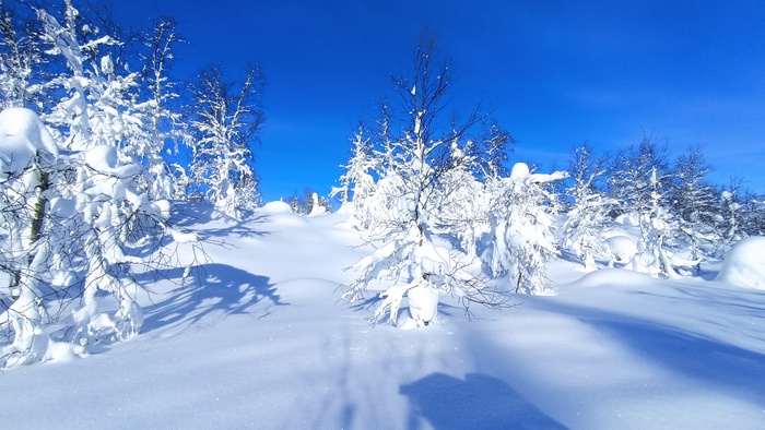 Спустя минут 30 мы все-таки достигли нашей цели. Добрались до отметки 839 метров г. Маннепахк. Оттуда открылся такой вид, такие просторы... Словами просто не передать, да и фотографией тоже. Я когда заглушил снегоход, сделал оборот на 360° вокруг свои оси, и прихренел от такого вида... Потом минуты три просто молча ворочал голову и смотрел.
