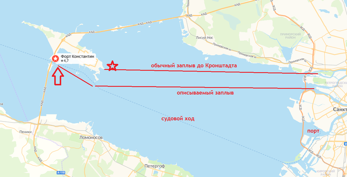 Также очень важный момент по навигации заключался в том, что самая финальная часть заплыва проходила по краю Главного корабельного фарватера. Обычный заплыв до Кронштадта (я его в том же 2017 году проплыл летом, о чем расскажу позже), проводится в другой половине залива, огромные пароходы я видел очень издалека. В-общем, в конце капитану яхты надо было бы втройне тщательно вести свою посудину и координировать действия спортсменов, чтобы уже ошалевшие к тому времени пловцы находились в безопасности.