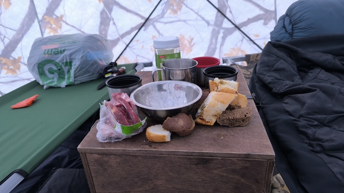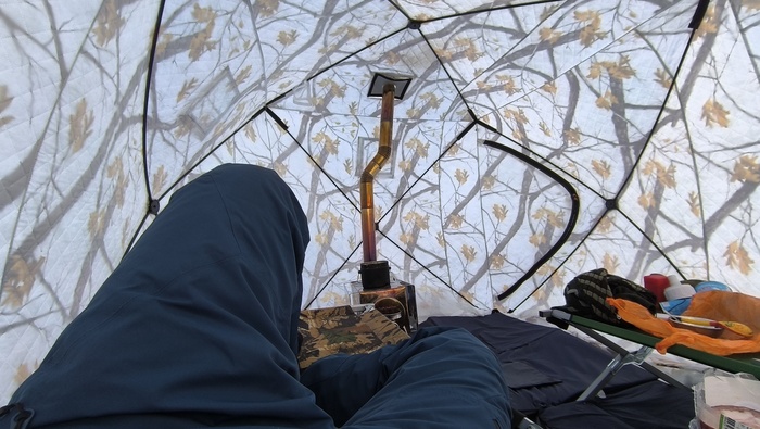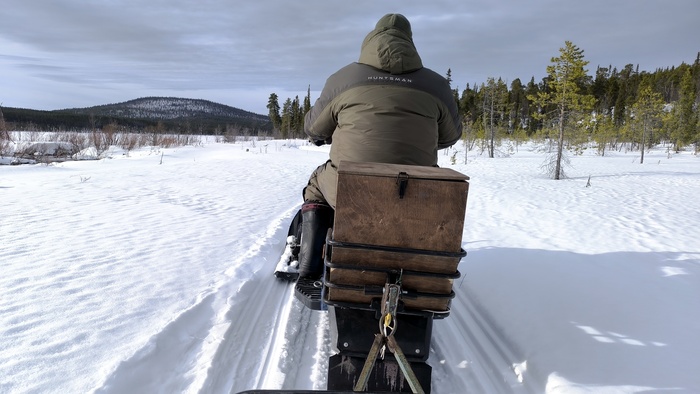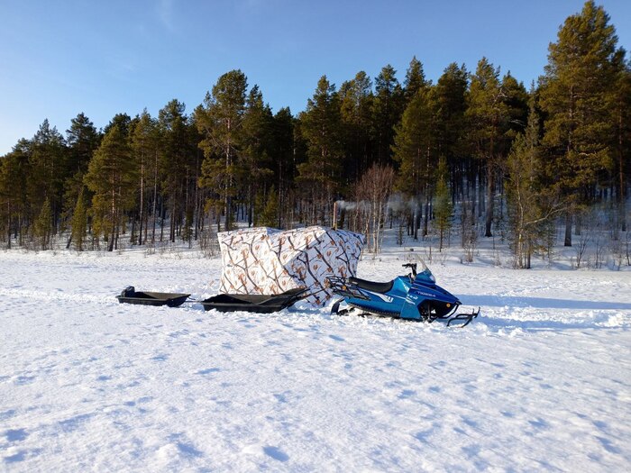 Место для рыбалки находится в живописном лесу в пределах родовых угодьев. Бурить лунку и сидеть с удочкой на лютом морозе несколько часов — идея плохая. Нужно много времени, результат не гарантирован, а основное занятие — это всё-таки оленеводство. Поэтому тут поступают по-другому.