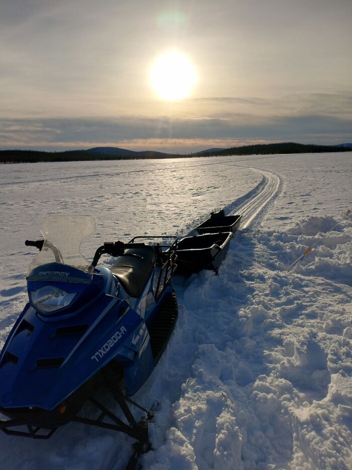 Мы ночевали в стойбище оленеводов ханты. Для того, чтобы отправиться на рыбалку, пришлось встать пораньше. На рыбалку отправились на нартах, прицепленных к «Бурану». Я решил протестировать национальную одежду ханты — малицу из оленьих шкур. Потрясающе теплая вещь.