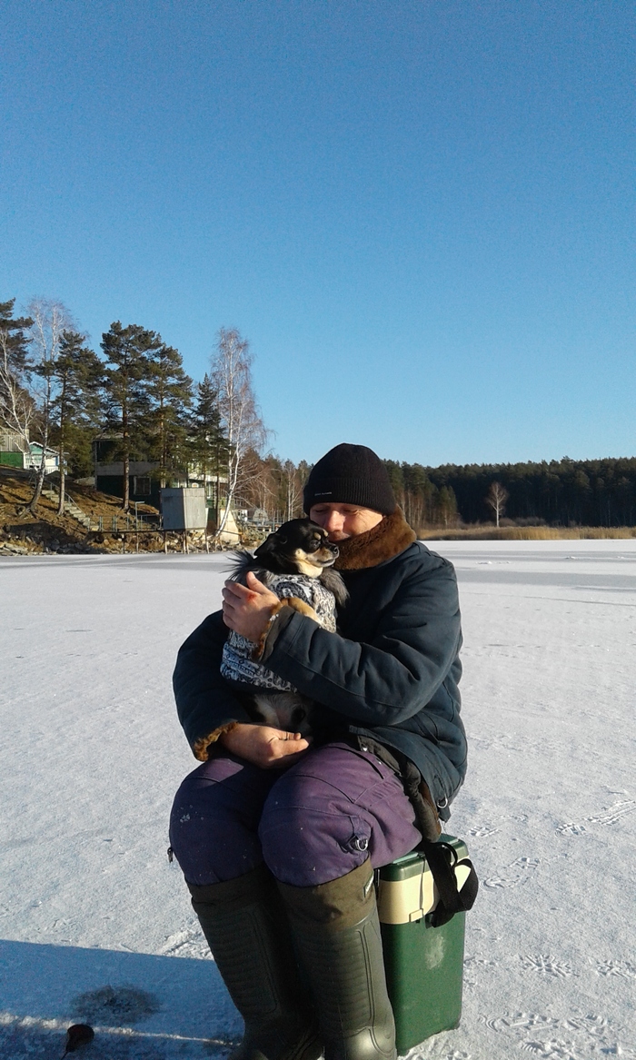 Чих (единственное прижившееся имя в семье великоразмерного чихуахуа) обожает эти рыболовецкие выезды. Имеет собственную экипировку. Бегает между всех лунок, пытается зализать всех рыб перед их отпуском в лучшее будущее. И жрет, зараза, всю незакрытую наживку. Хоть опарышей с мормышкой, хоть малинку, хоть червя. Хотя червей, по-моему, предпочитает больше…наверное мясо у них вкуснее. Ему и рыбе виднее, поверила без пробы).
