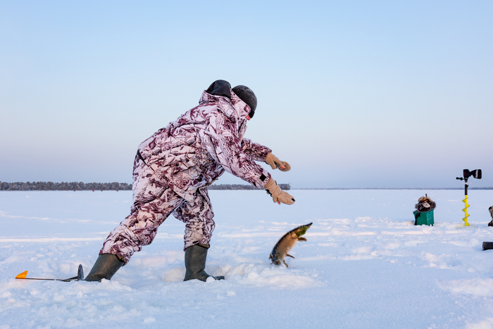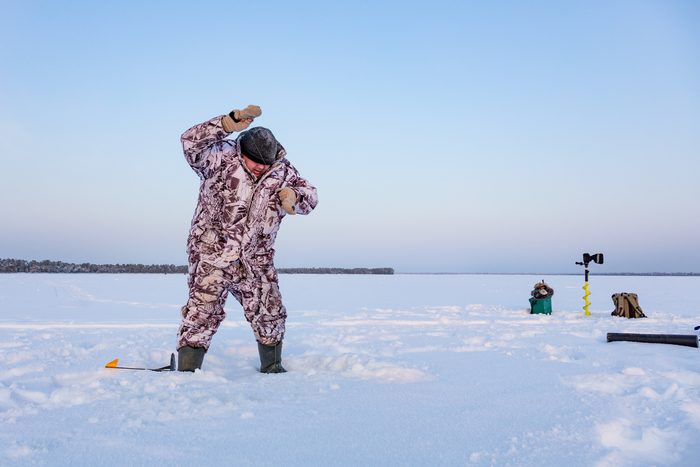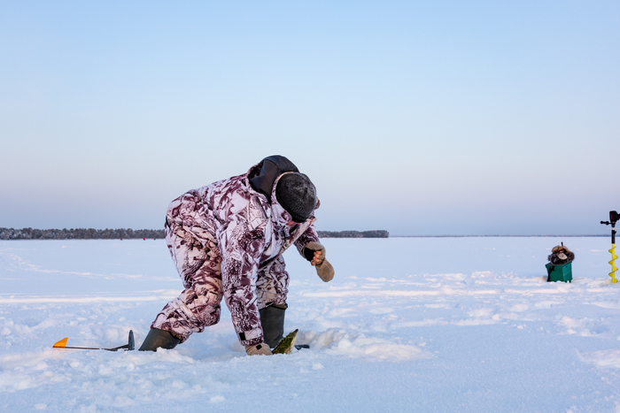 Мы были первыми, но пока собирали снасти и сани начали активно подъезжать рыбаки. Прошагав по озеру метров 400, мы определили точку и начали выставляться. В начале девятого утра по десять жерлиц на человека были благополучно установлены.