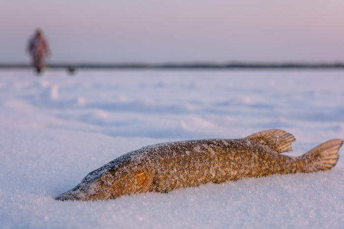 Первая поклевка случилась когда куранты в Москве пробили 7 часов утра - 9 по нашему. Я подбежал к жерлице, катушка активно разматывалась, но в определённый момент леска запуталась на катушке и пришлось срочно подсекать. Мне попалась небольшая щука весом около килограмма.