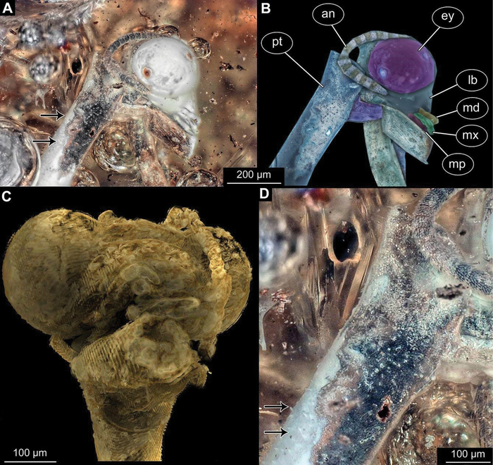 Образец длиной почти 2 сантиметра был изучен с помощью комбинации методов, включая микроскопию и рентгеновскую микротомографию — рентгеновские лучи используются для создания поперечного сечения и трехмерной модели организма.