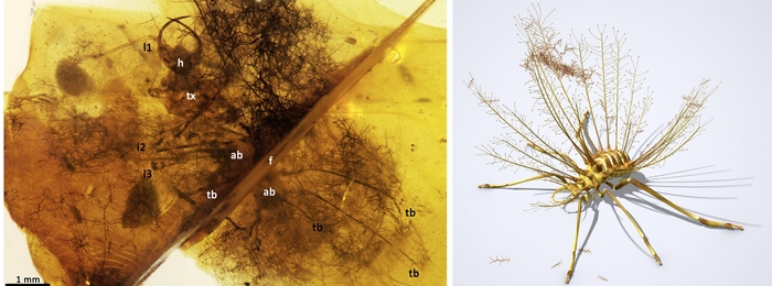 Личинка Hallucinochrysa diogenesi из испанского янтаря. Изображение из статьи R. Pérez-de la Fuente et al., 2012. Early evolution and ecology of camouflage in insects