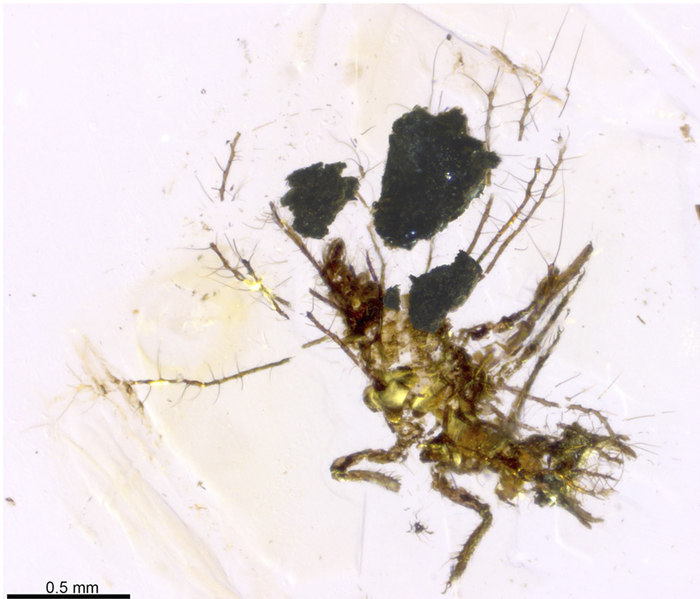 Личинка Tyruschrysa melqart из ливанского янтаря, несущая на спине куски растительного детрита. Фото из статьи R. Pérez-de la Fuente et al., 2018. A soil-carrying lacewing larva in Early Cretaceous Lebanese amber