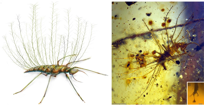 Личинка златоглазки из бирманского янтаря с характерными выростами по бокам тела. В рамке в правом нижнем углу приведена фотография эмподия (непарная присоска между коготками лапки) с расширением на конце. Эмподий такой формы является одним из отличительных признаков личинок златоглазок. Длина масштабного отрезка: A — 2 мм, B — 0,1 мм. Изображение из статьи B. Wang et al., 2016. Debris-carrying camouflage among diverse lineages of Cretaceous insects и из дополнительных материалов к этой статье