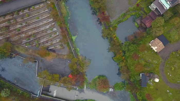 Ловим здесь. Казалось бы, небольшой прудик, а на самом деле фрагмент сети каналов и проток. Видите водоросли на дне? Там прячется наш змей-горыныч.