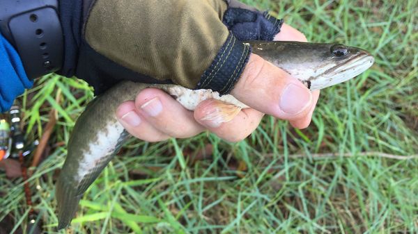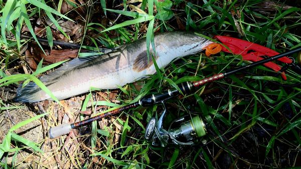Вот и первый зверь! Небольшой Channa striata соблазнился на довольно крупную приманку.